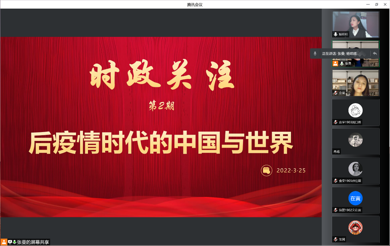 为进一步丰富《毛泽东思想和中国特色社会主义理论体系概论》的课程形式和内容,全面了解学生在疫情影响下的思想动态,及时引导学生理性认知疫情影响,坚定“四个自信”,3月25日晚,由马克思主义中国化系教师张曼、杨君、余雯组织的“时政关注”师生交流会第二期“后疫情时代的中国与世界”以线上形式在腾讯会议举行,来自南北校区20余名学生参加了本次交流会。会议由张曼老师主持。