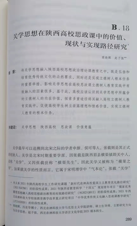 近日,由社会科学文献出版社出版的《陕西蓝皮书:陕西文化发展报告(2022年)》正式面向社会发行。英国上市官网商晓辉博士主笔的研究报告《关学思想在陕西高校思政课中的价值现状与实现路径研究》成功入选。该研究报告受到陕西省高校学生工作研究项目和陕西省教育科学“十四五”规划项目以及英国上市公司官网365校级教学改革研究重点项目的资助。